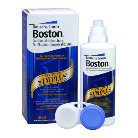 Un frasco de 120ml de solución única Boston Simplus indicada para la limpieza y desinfección de las lentillas rígidas y permeables al gas. Incluye un portalentes.